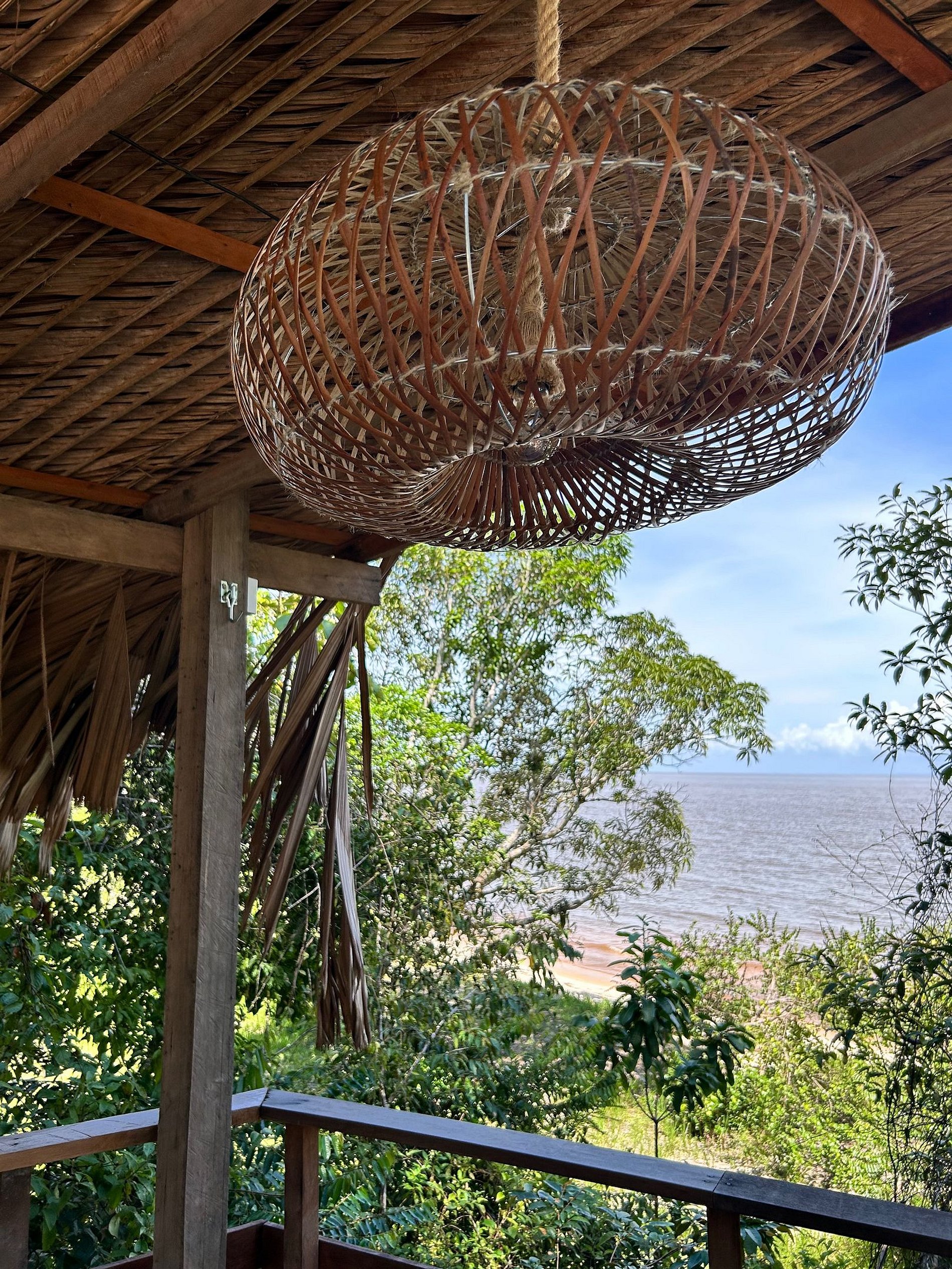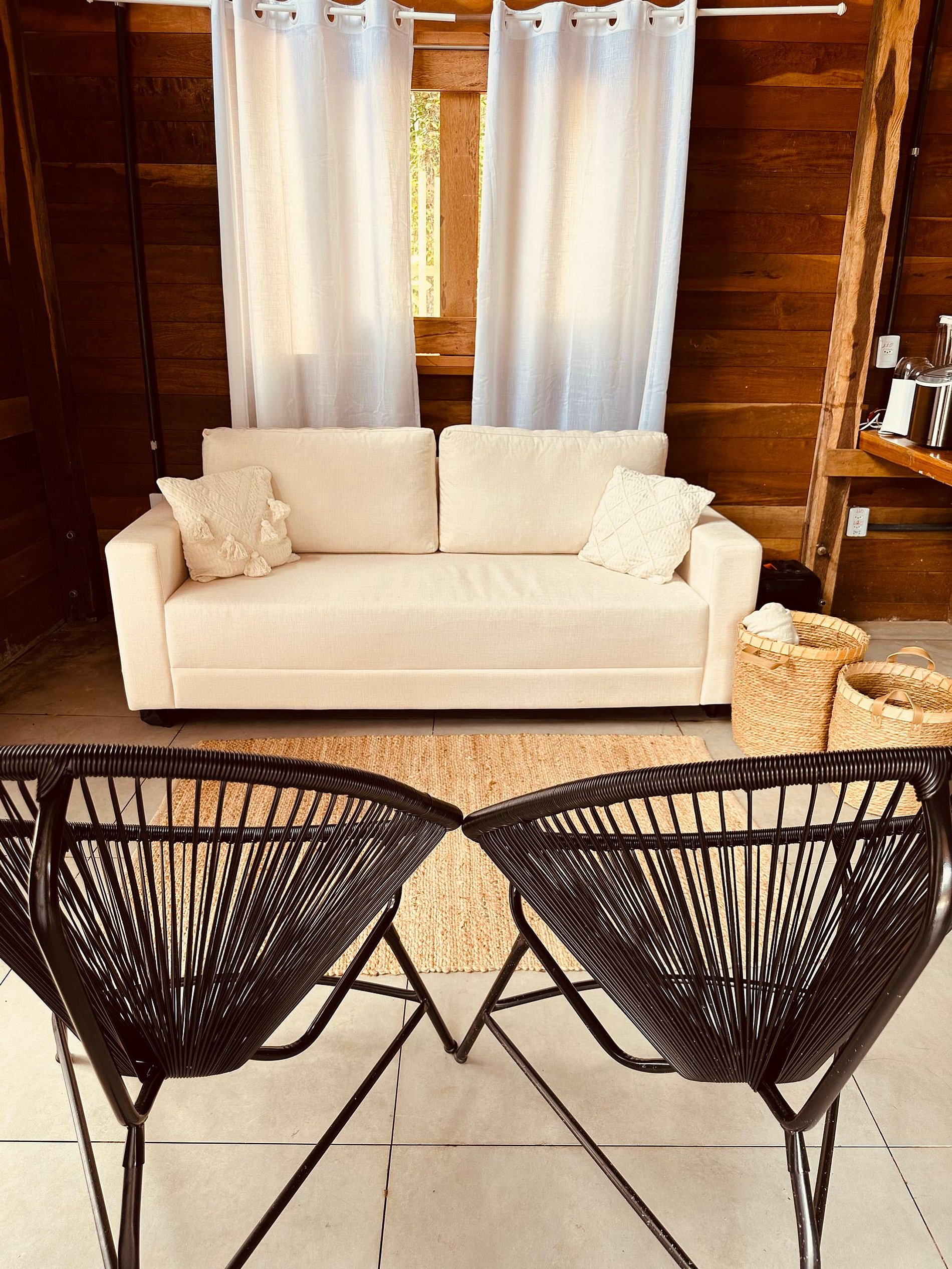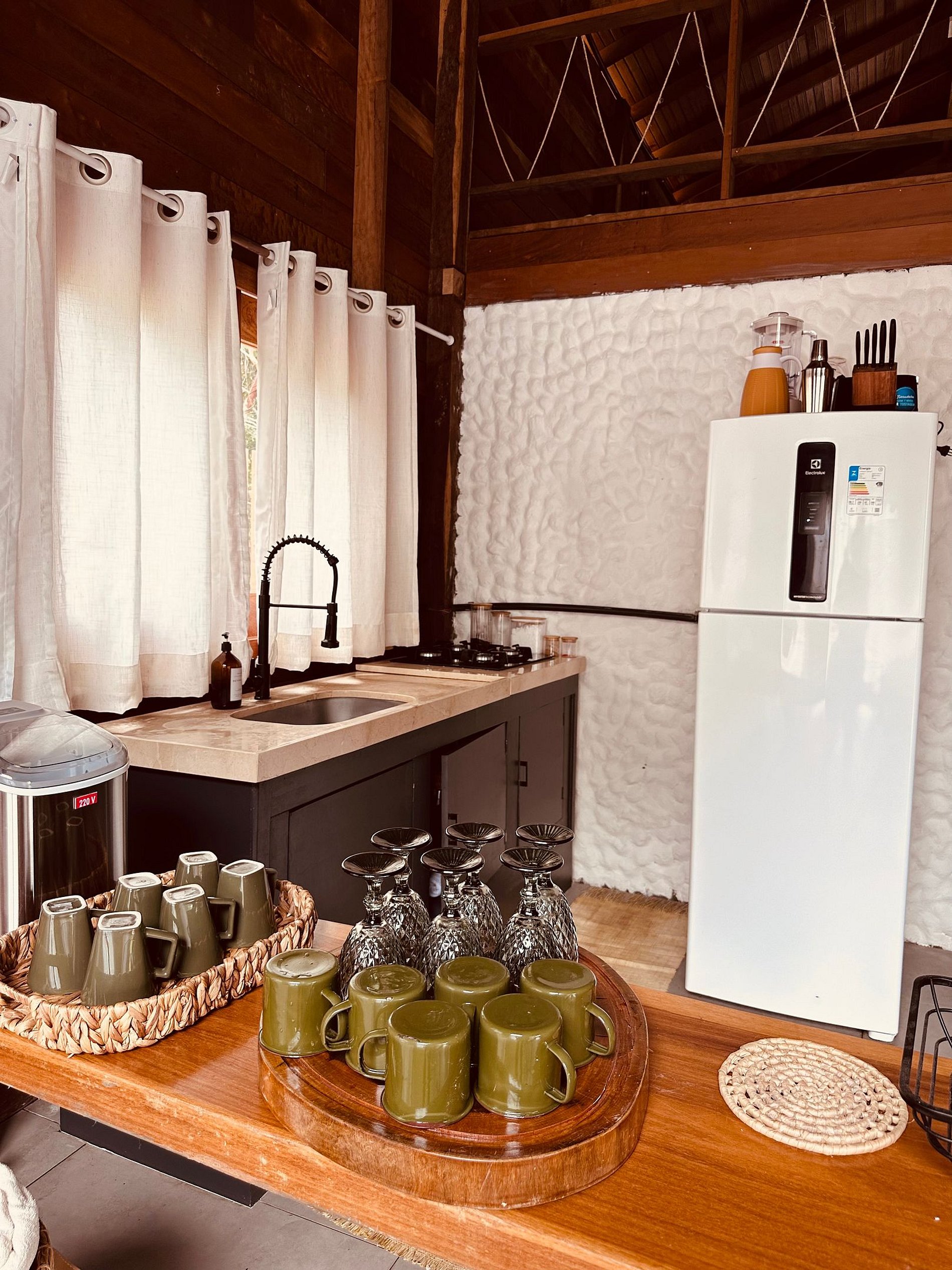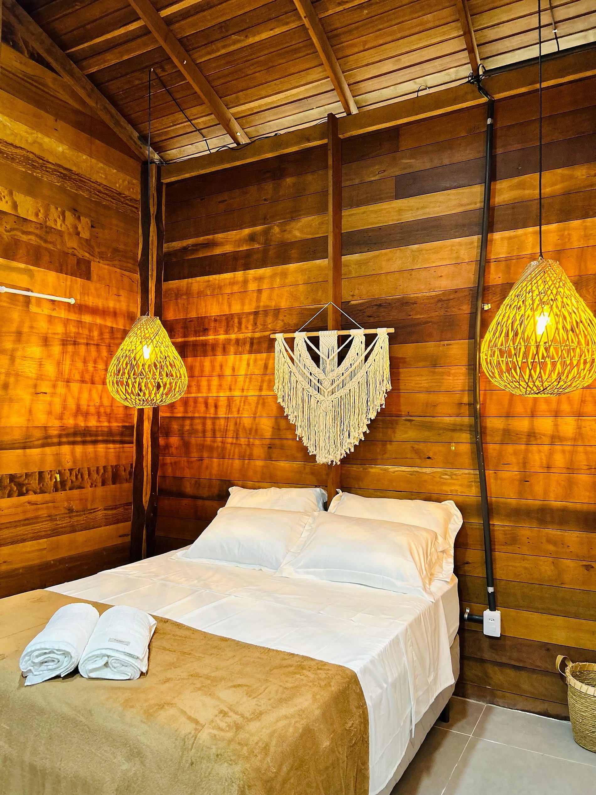 O chalé é muito charmoso, tem uma decoração boho minimalista, no estilo rústico contemporâneo, sem esquecer suas raízes amazônicas. Além de uma iluminação quente (opcional) para trazer mais conforto e sensação de relaxamento.