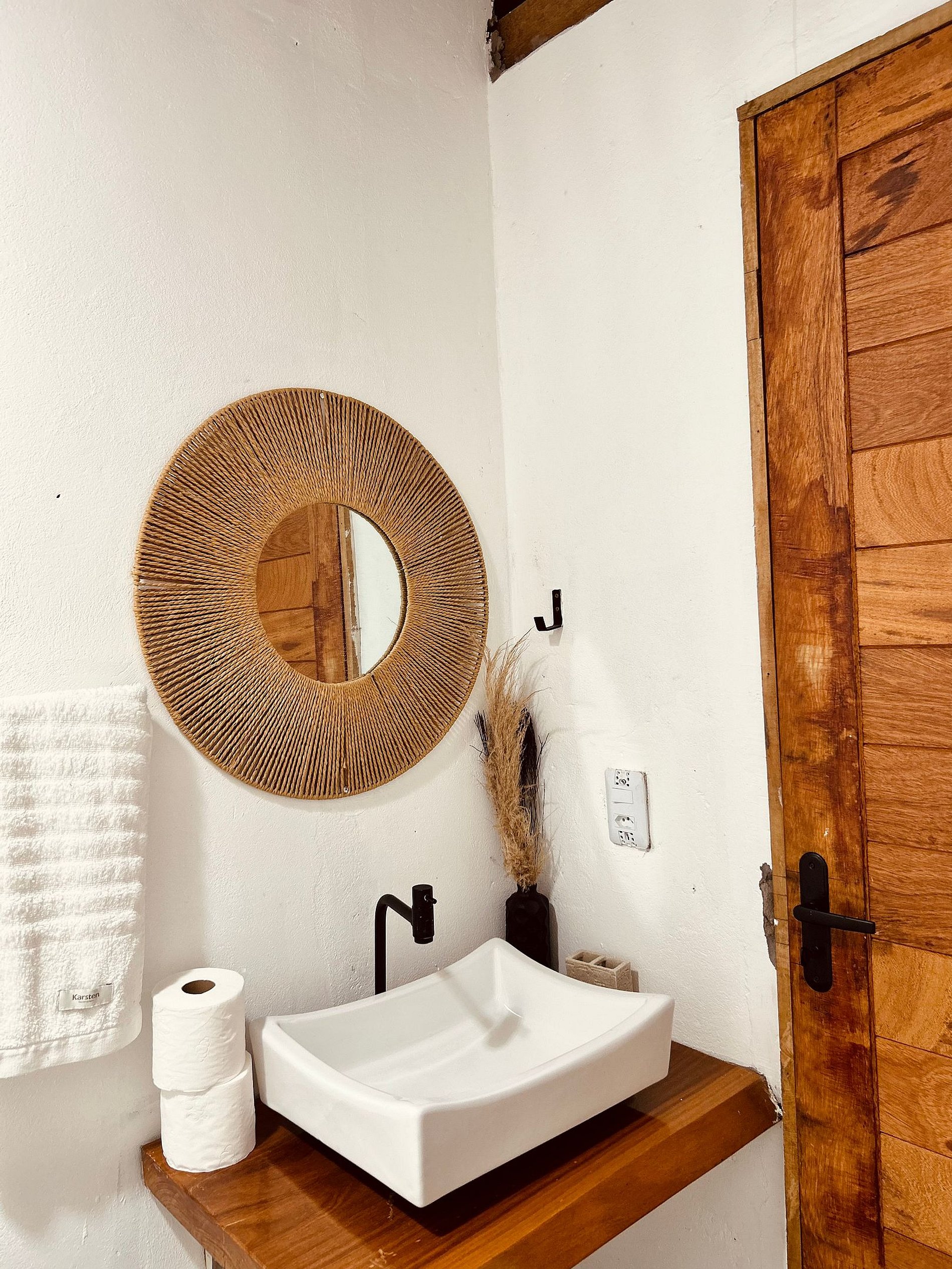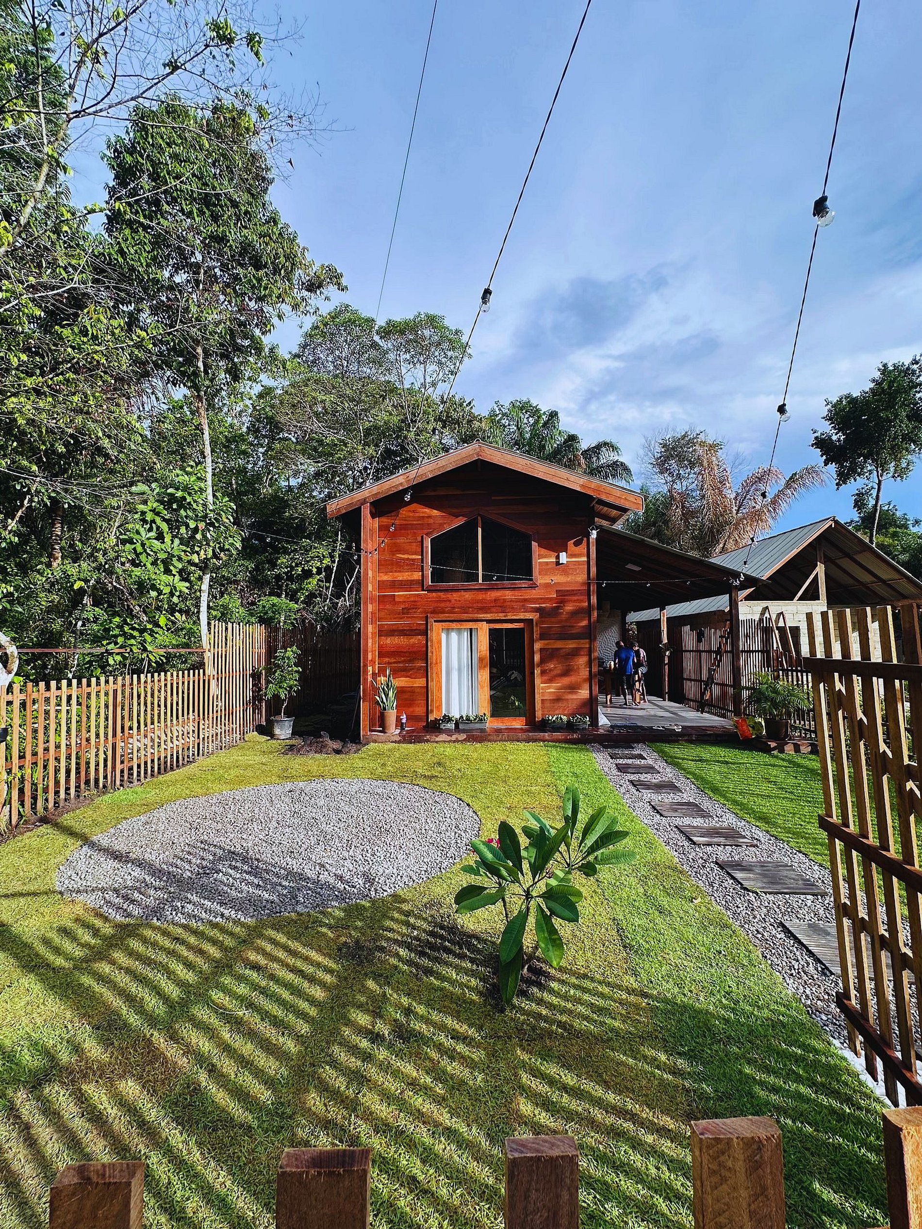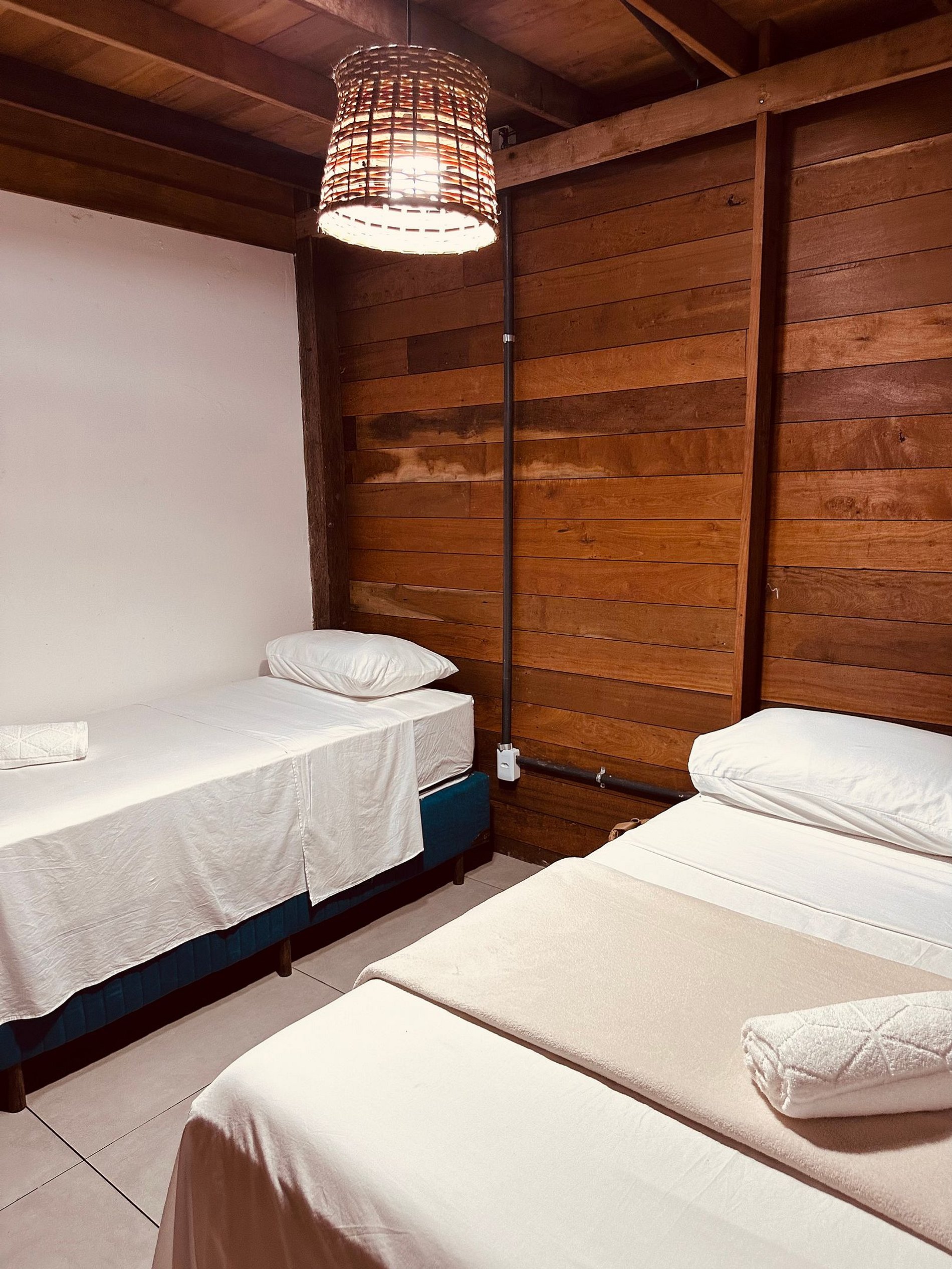 O chalé é muito charmoso, tem uma decoração boho minimalista, no estilo rústico contemporâneo, sem esquecer suas raízes amazônicas. Além de uma iluminação quente (opcional) para trazer mais conforto e sensação de relaxamento.